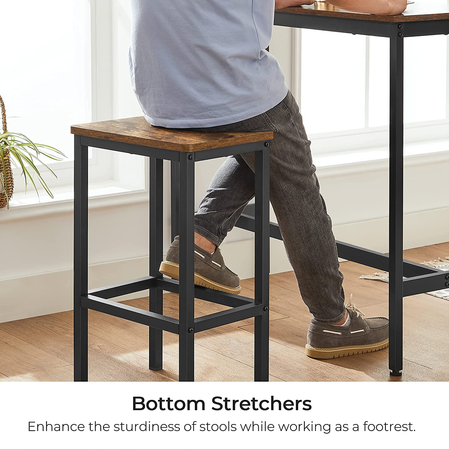 Item Dimensions LxWxH- 100.1 x 39.9 x 89.9 Centimeters Make a Breakfast Corner: The tall bar table with a size of 39.4” x 15.7” is spacious for holding your coffee, croissant, and juice; the two stools with a size of 15.7” x 11.8” each allow 2 people to comfortably enjoy breakfast—one corner is enough Cheers, Bar Lovers: Whether you like a drink with friends or a light breakfast before you’re on the go, this bar table and chairs set is sure to delight. With rustic brown and black tones, it rounds off your leisure or busy times with a cozy, pub-like vibe Also a Hit Down Below: A beautiful table top is indispensable. At the same time, the base of the tall bar table should also impress, but with stability. This is ensured by the steel stretcher bar down below Assembly Instruction : The product require (Do-it-your self) basic self assembly at customer end not require any carpenter and comes with self assembly instructions along with necessary accessories.